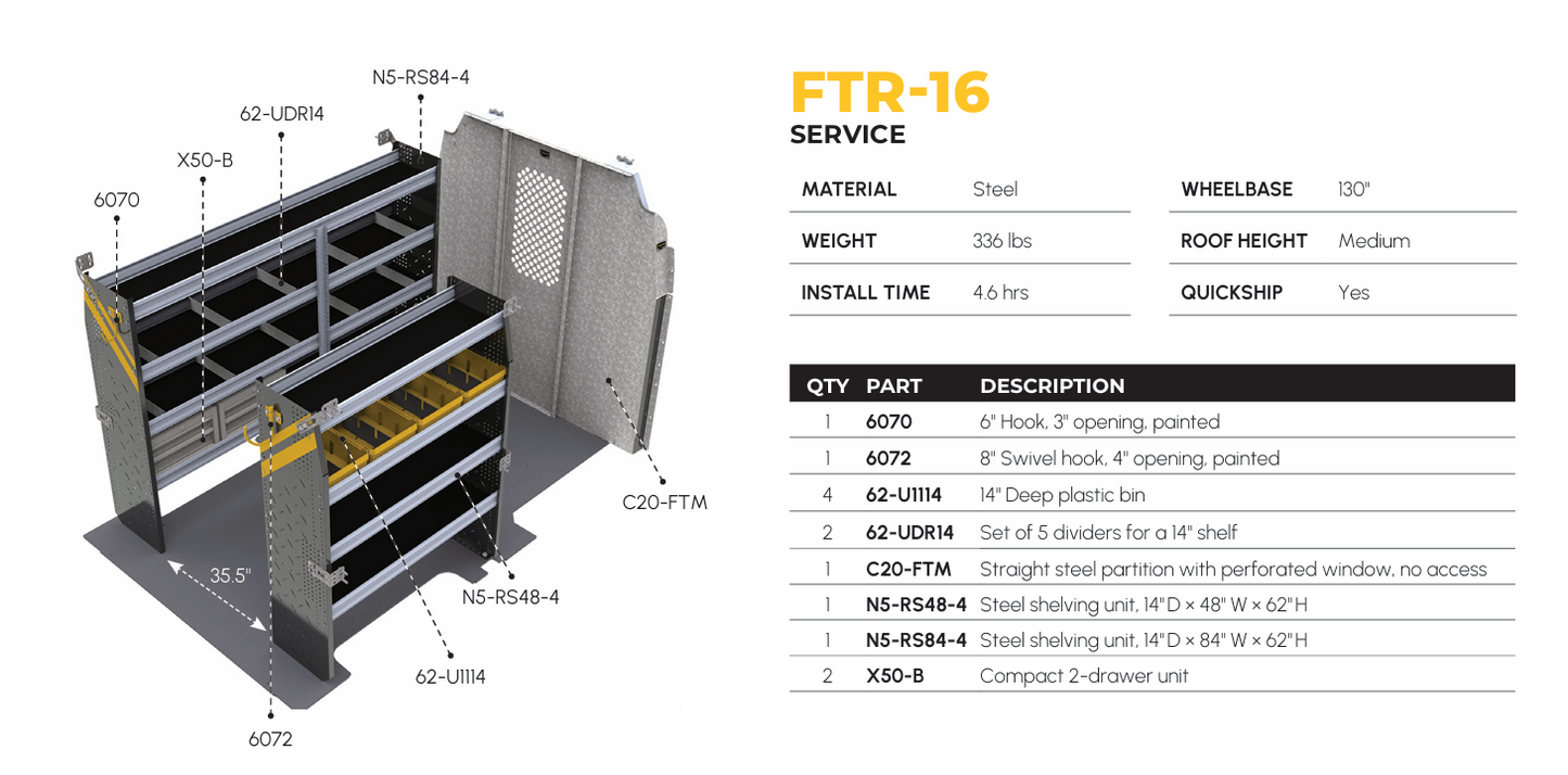 Mobile Service & Plumbing Van Shelving Package, Ford Transit Med Roof, 130” WB – FTR-16