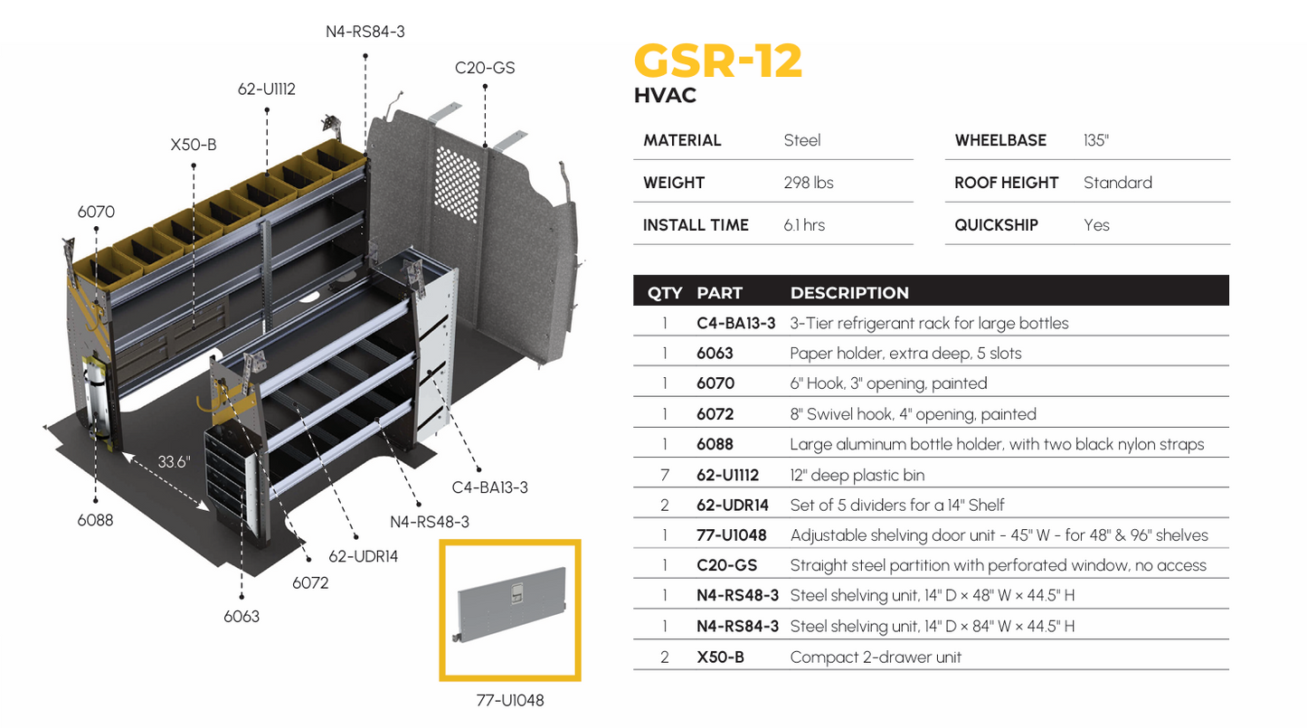 HVAC Van Shelving Package, Chevrolet Express, 135” WB – GSR-12