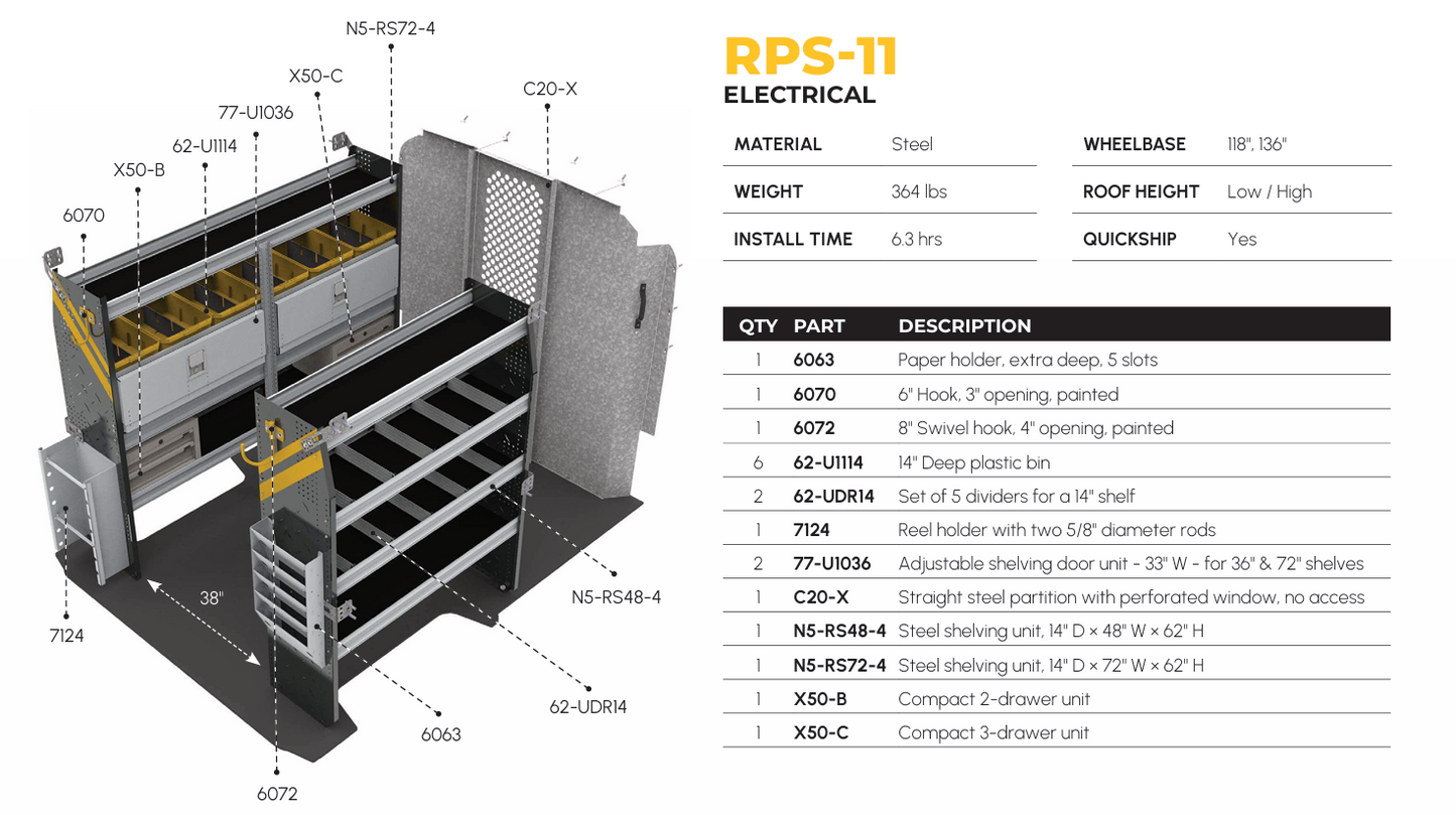 Electrician Van Shelving Package, RAM ProMaster, 118″ / 136″ Wheelbase. Model: RPS-11