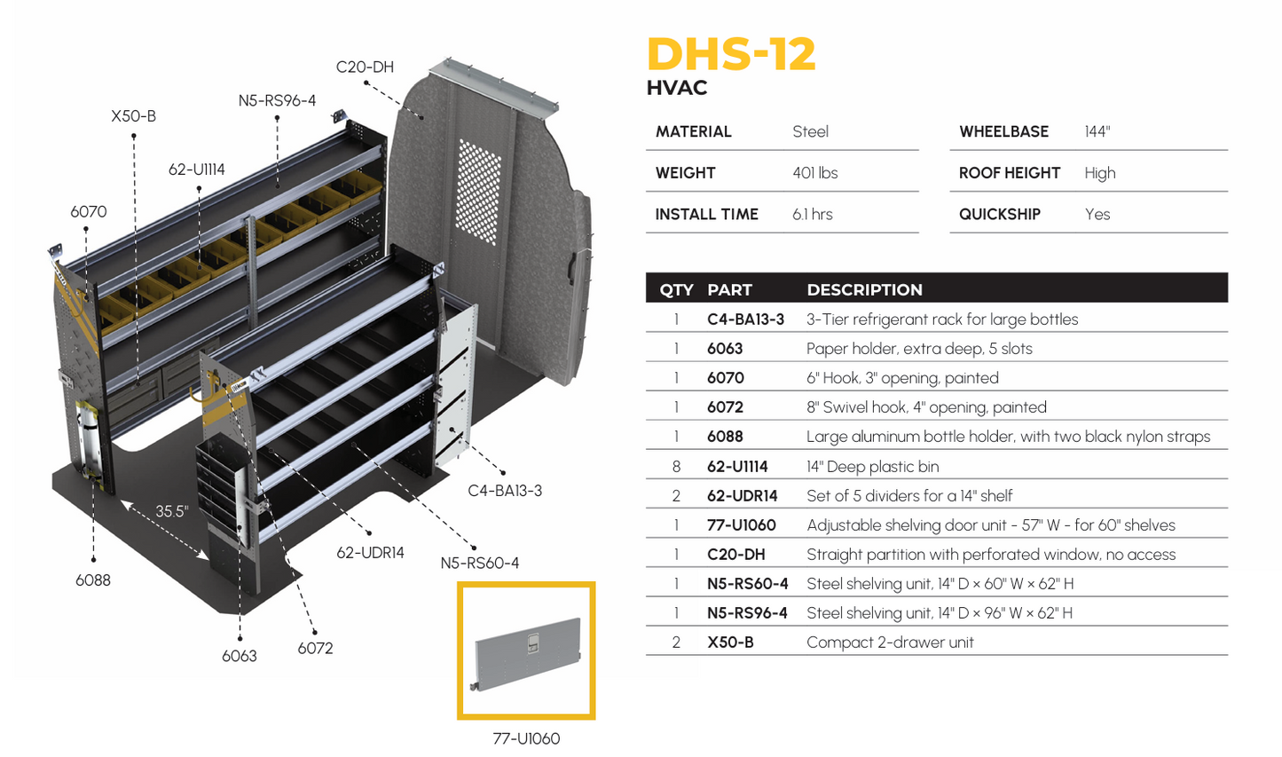HVAC Van Shelving Package, Mercedes Sprinter, 144″ WB – DHS-12