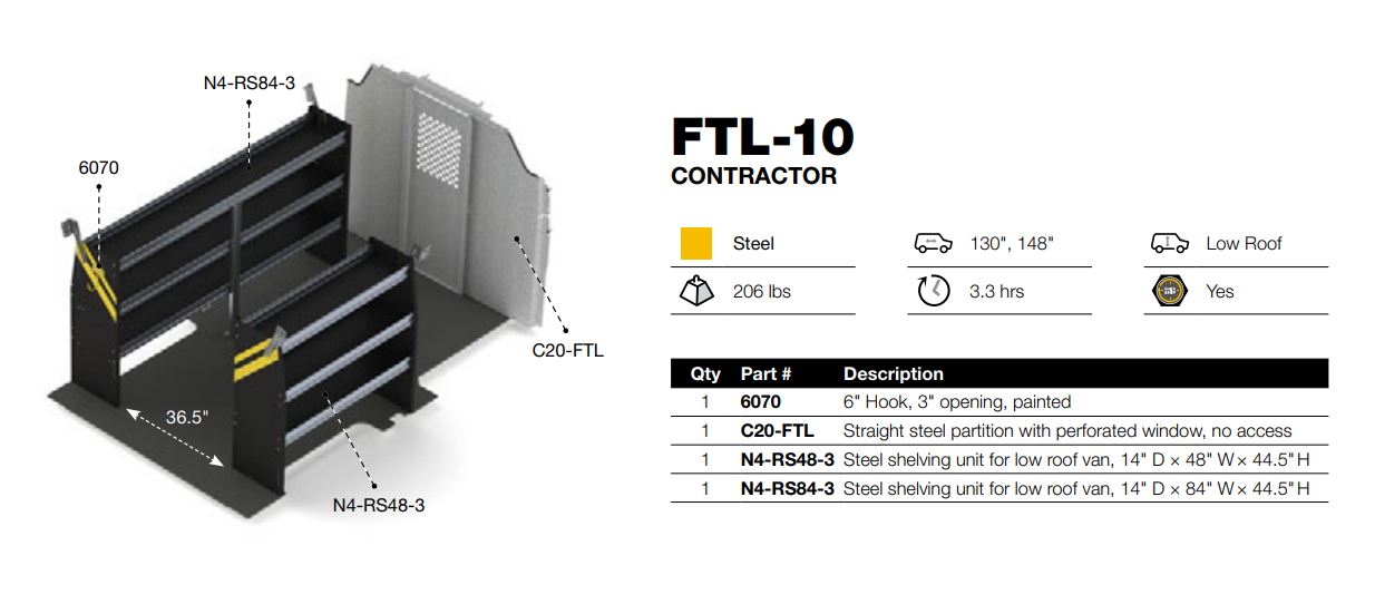 Ranger Design Contractor Package, compatible with Ford Transit Low Roof 130", 148" WB. Model: FTL-10
