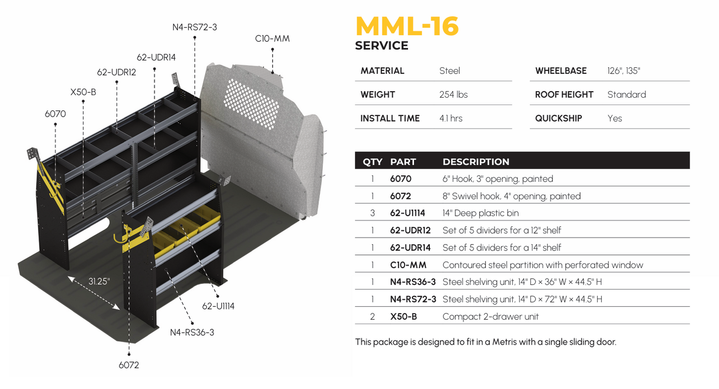 Mobile Service & Plumbing Van Shelving Package, Mercedes Metris all wheelbases. Model: MML-16