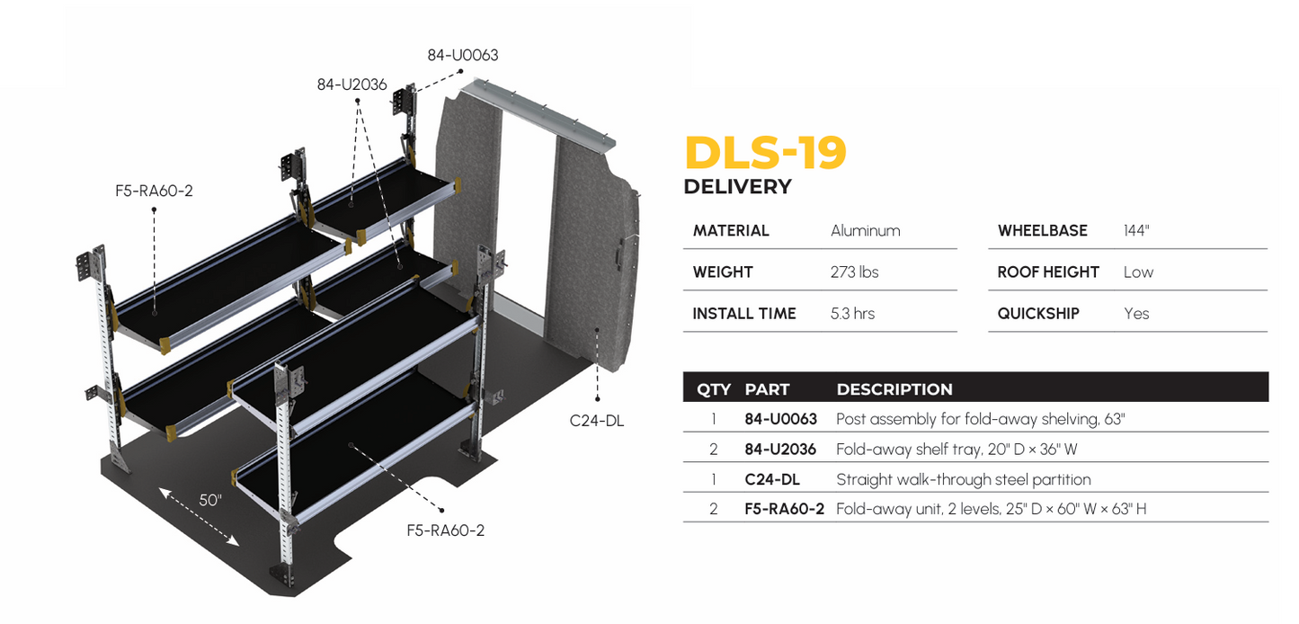 Delivery Van Shelving Package, Mercedes Sprinter Low Roof, 144” WB – DLS-19