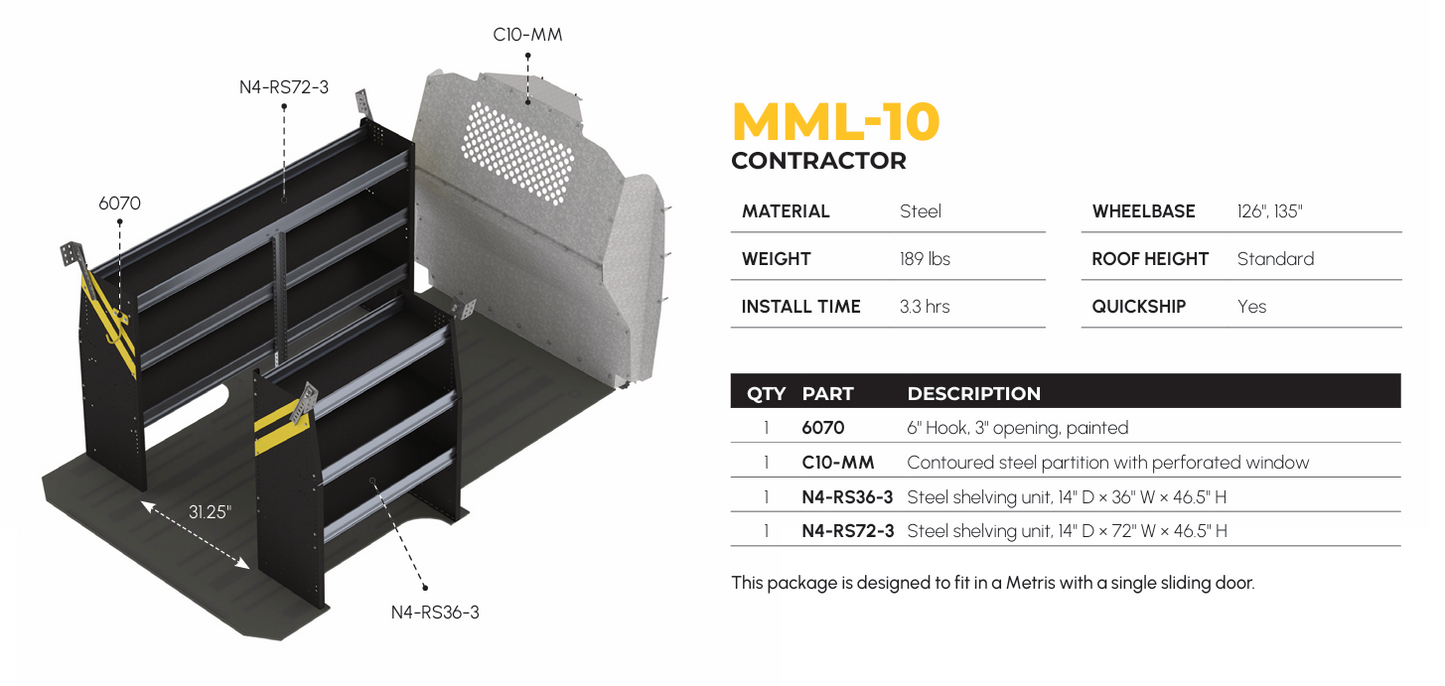 Ranger Design Contractor Package, compatible with Mercedes Metris all wheelbases. Model: MML-10